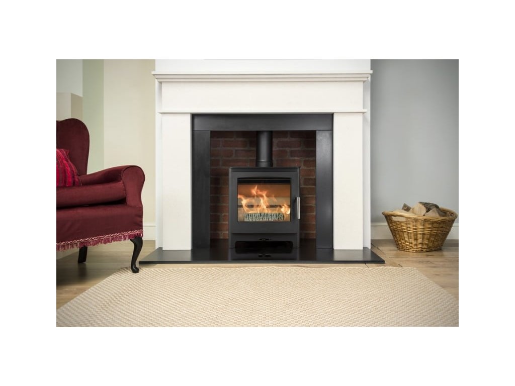 Spalovací komora je široká pro pohodlné přikládání a velké sklo umožňuje hezký výhled na plameny.