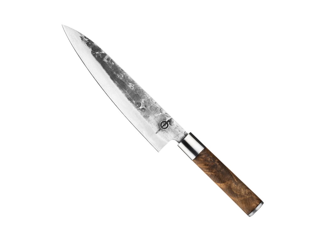 Materiál japonská ocel VG10 / tvrdost 60 Rockwell Délka / tloušťka čepele 20,5 cm / 2 mm Úhel broušení 18° Provedení ruční kování v pěti vrstvách / rukojeť z kořenového dřeva Balení dřevěný boxDoplňkové parametry