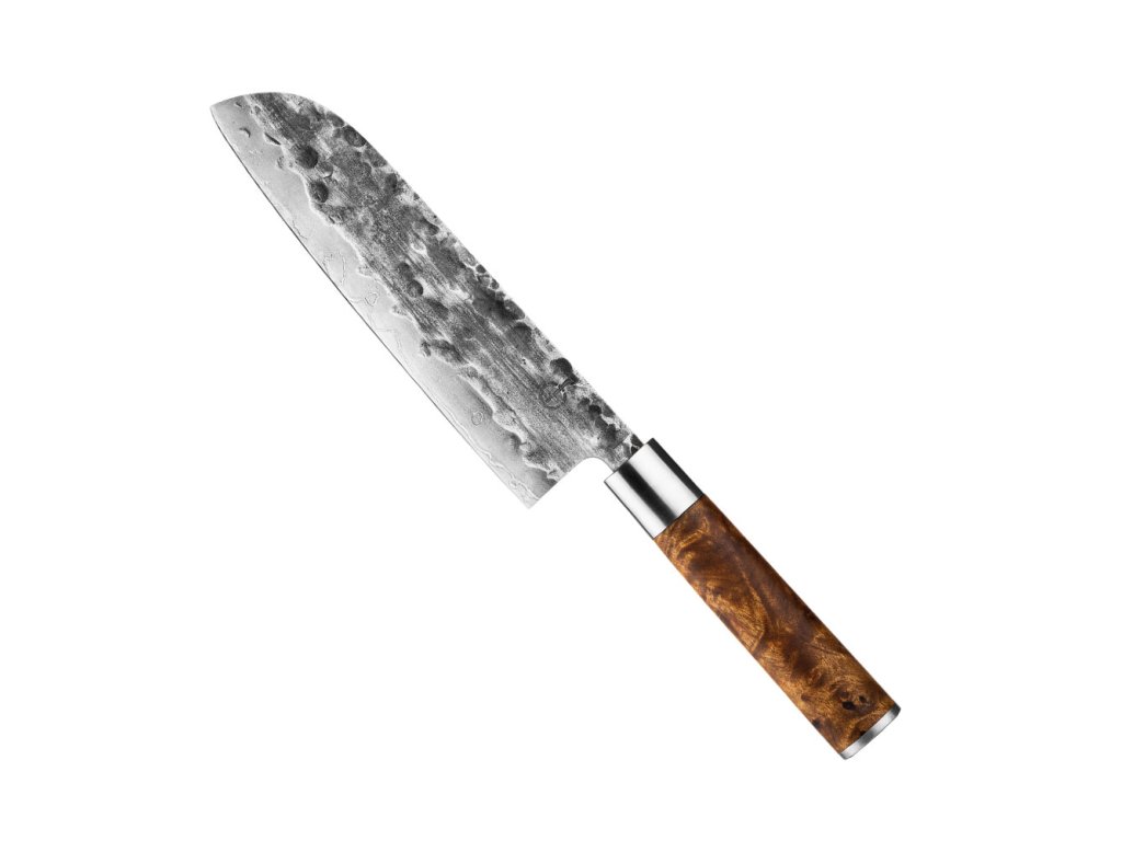 Materiál japonská ocel VG10 / tvrdost 60 Rockwell Délka / tloušťka čepele 18 cm / 2 mm Úhel broušení 18° Provedení ruční kování v pěti vrstvách / rukojeť z kořenového dřevaDoplňkové parametry