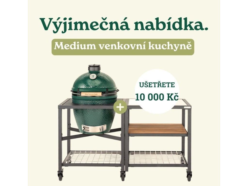 · Gril Big Green Egg MEDIUM · ConvEGGtor · Pohrabáč · Základní a nástavbový rám stolu · Mřížka z nerezové oceli · 2× Výplň z akáciového dřeva · 3× Sada koleček (2 ks)