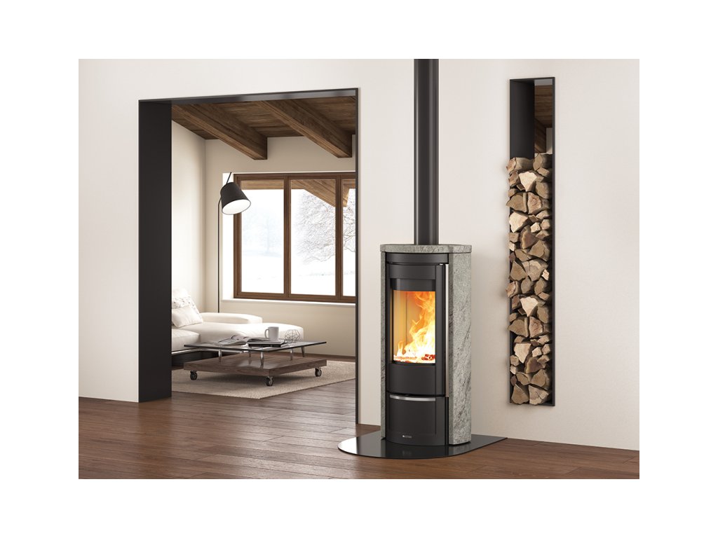 Vertikální topeniště umožňuje přikládání i větších polen. Velké prosklení zaručuje fantastický pohled na hru plamenů v průběhu hoření paliva v topeništi. Kamna mají litinovou přírubu s možností napojení na externí přívod vzduchu. Tím je možné zamezit čerpání vzduchu z interiéru. Jejich kulatý tvar je vhodný k instalaci ke stěně i do rohu. Ve spodní části pod topeništěm je snadno odnímatelný popelník. Ergonomické chromované madlo usnadní přikládání paliva.