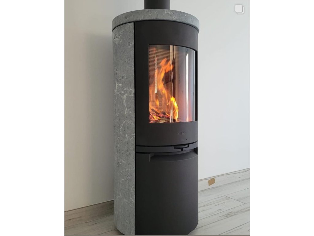 - Masivní obklad s přírodního kamene (mastek / tmavý pískovec Blackwood / vápenec) zajišťující mnohem vyšší akumulační vlastnosti kamen