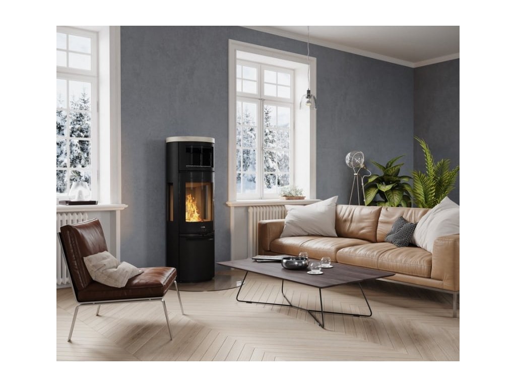 Velké prosklení zvýrazňuje krásné a efektivní spalování, které lze snadno regulovat pomocí ovládacího kolečka přívodu vzduchu na přední straně. Dvířka můžou být vybavena automatickým uzavíráním, což zvyšuje komfort užívání.