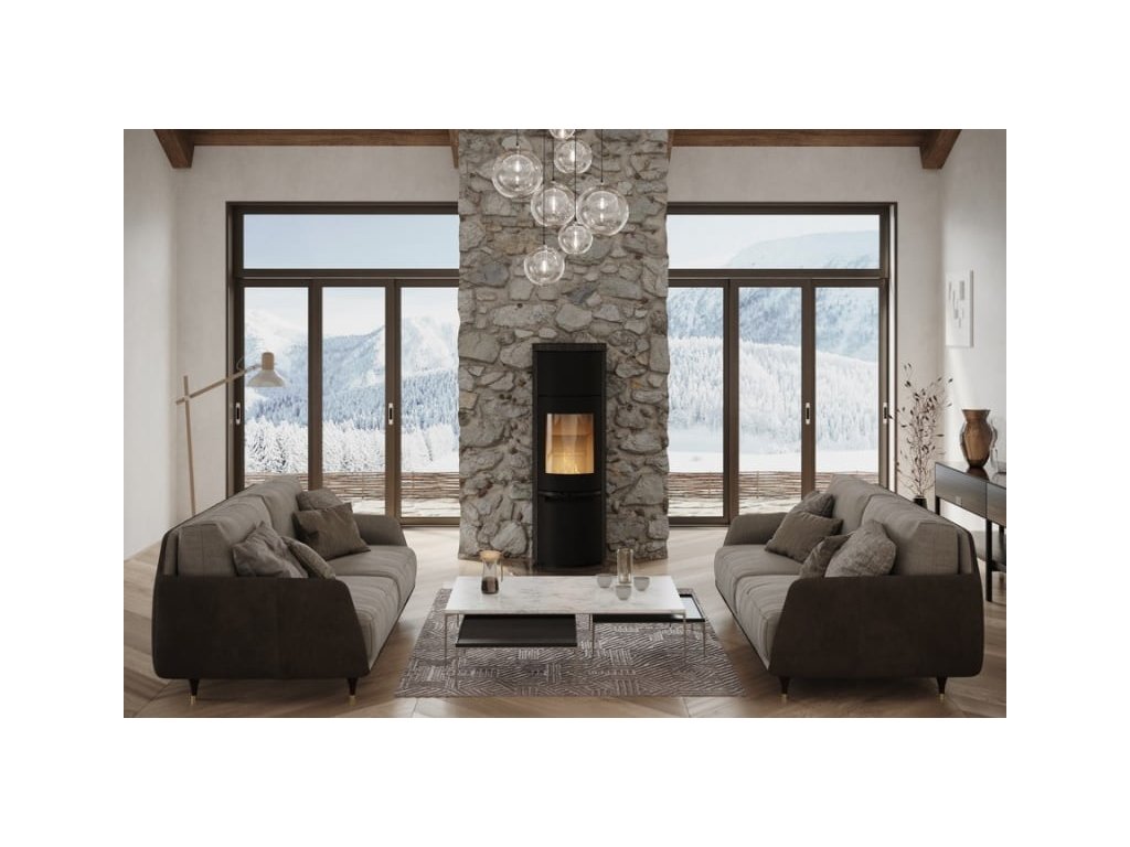 Velké prosklení zvýrazňuje krásné a efektivní spalování, které lze snadno regulovat pomocí ovládacího kolečka přívodu vzduchu na přední straně. Dvířka můžou být vybavena automatickým uzavíráním, což zvyšuje komfort užívání.